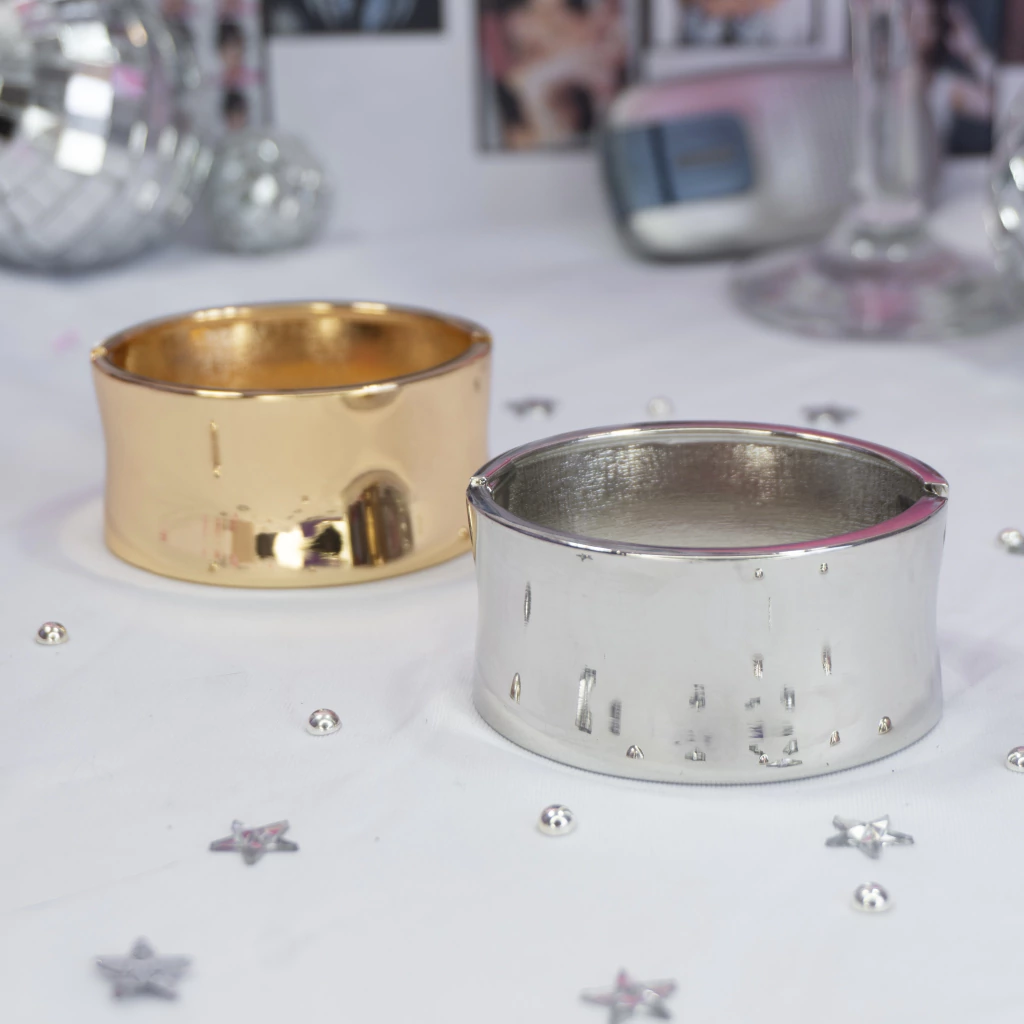 Com 3 cm de altura, ele tem um design reto e bold . O sistema de abre e fecha garante praticidade no uso, enquanto o acabamento em metal com banho em verniz entrega brilho pra acompanhar todos os seus looks.