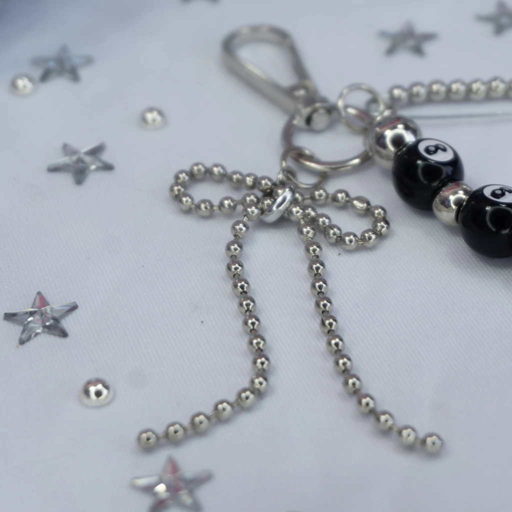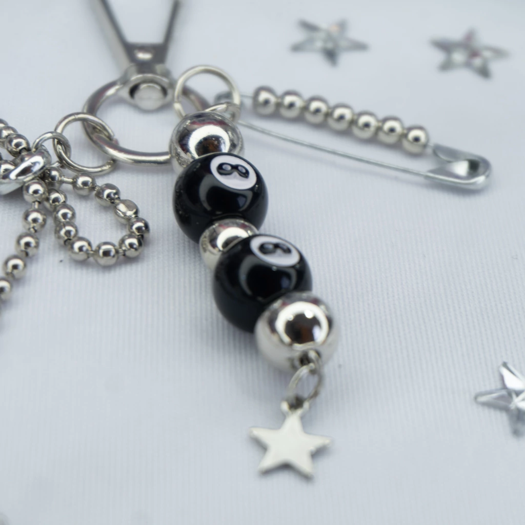 Com o icônico 8-ball como destaque, ele vem com um laço feito de corrente metálica e um alfinete customizado cheio de miçangas prateadas — detalhes que transformam esse chaveiro em um acessório cheio de atitude.