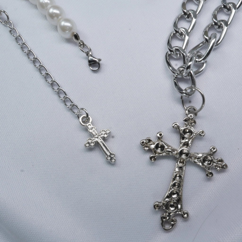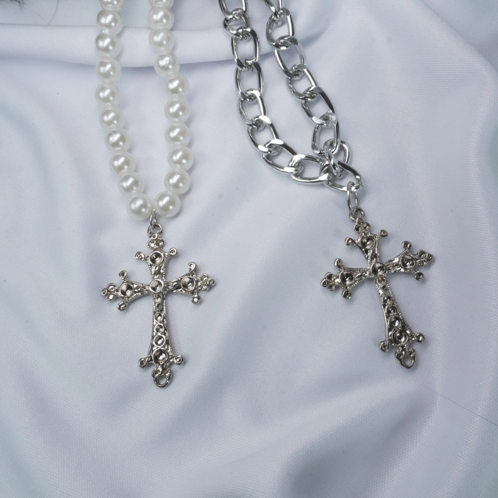 Um colar que está em alta e não podemos negar é o colar de cruz, ele traz aquele estilo que seu look precisa e você ainda pode escolher entre os dois modelos que temos pérolas ou corrente, ambos com um pingente de cruz todo trabalhado em alto relevo que deixa o colar mais lindo ainda além de uma mini cruz que da um acabamento especial no fecho.