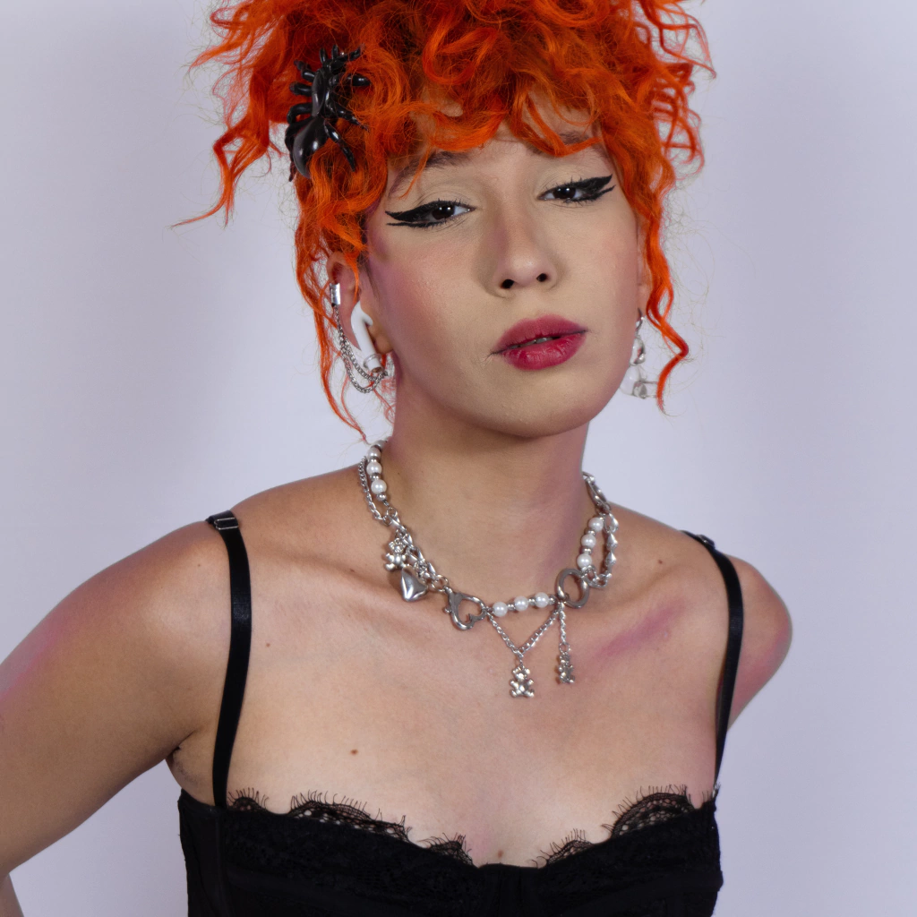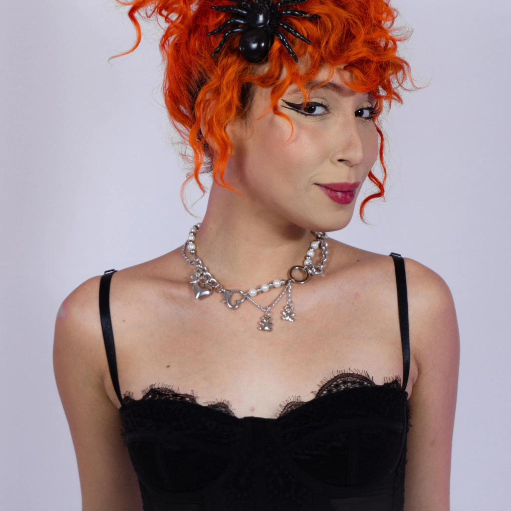 O colar Teddy é feito com pérolas, correntes e detalhes prateados trazendo a combinação de básico e estiloso num só acessório