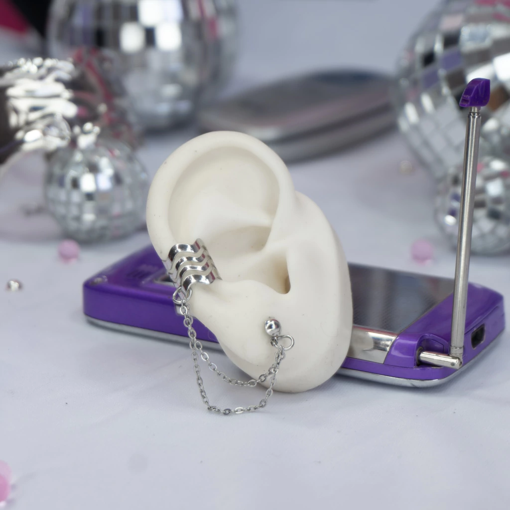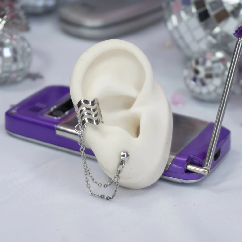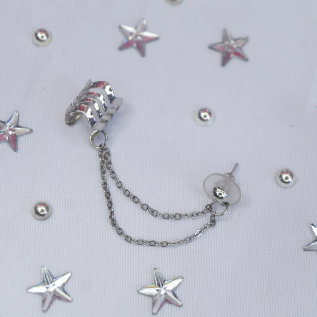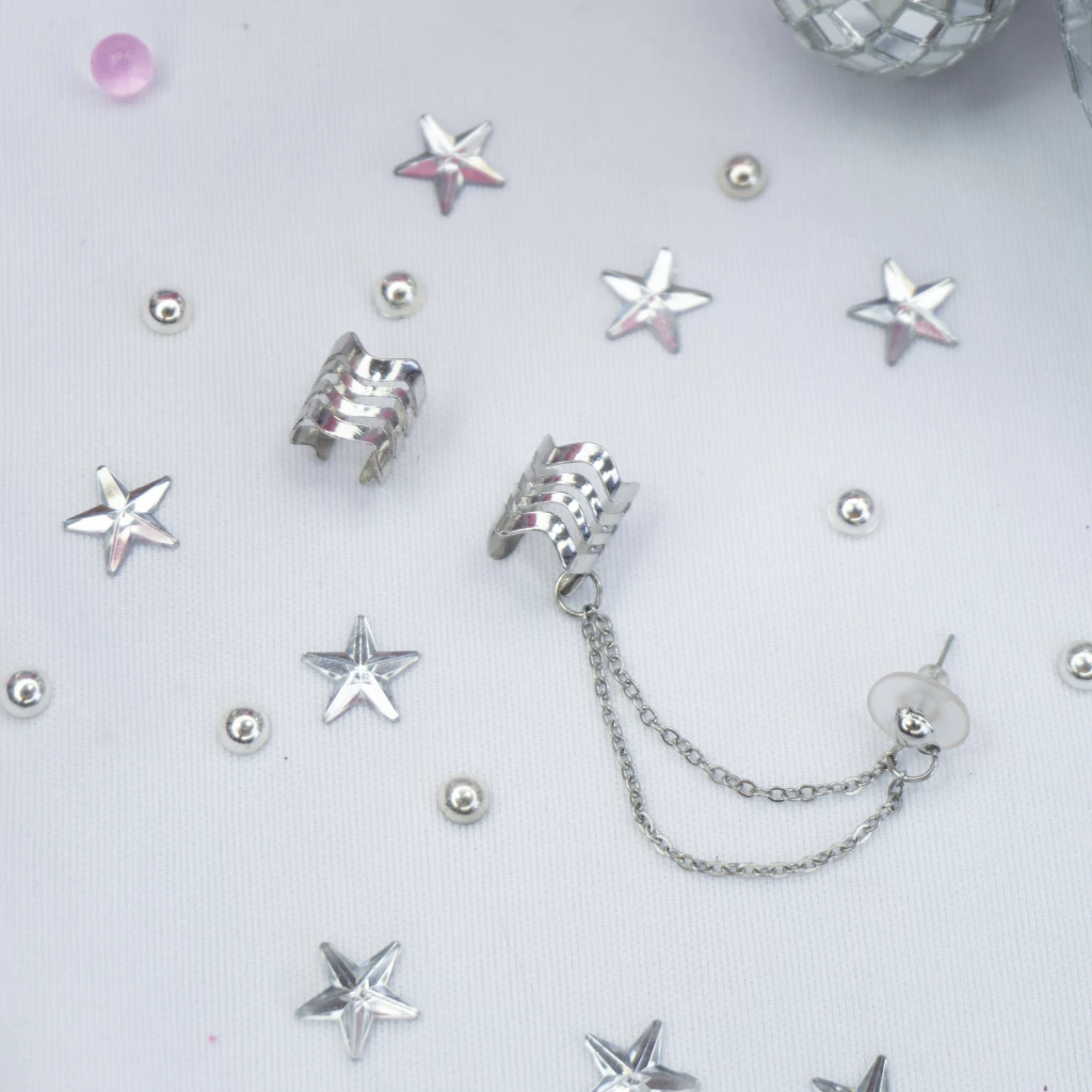 São duas versões: um modelo com corrente que prende no primeiro furo, criando um efeito marcante, e outro mais minimalista, ear cuff solto, perfeito pra usar sozinho ou no mix de brincos. Ambos são feitos em aço inoxidável, resistentes e superconfortáveis.